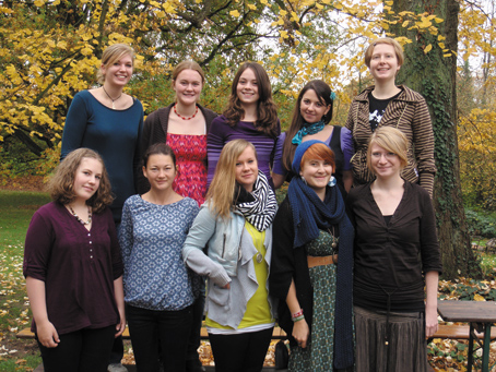 (Hintere Reihe: Theresa Seubold, 21, Deutschland/ Cordelia Merkl, 18, Deutschland/ Birte Jetter, 18, Deutschland/ Agnes Bosca, 25, Rumänien/ Julia Fehlisch (Leitung). Vordere Reihe: Hannah-Catharina Esser, 16, Deutschland/ Beáta Baidik, 24, Rumänien/ Tuulia Perttula, 20, Finnland/ Susanna Punkari, 22, Finnland/ Katharina Plagens (Leitung).)